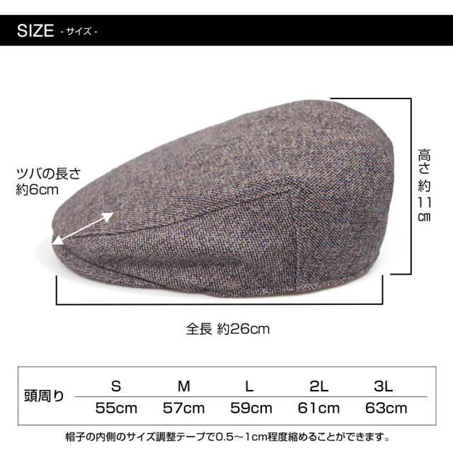| サイズ | S(55cm)、M(57cm)、L(59cm)、LL(61cm)、3L(63cm) ※帽子の内側のサイズ調整テープで0.5〜1cm程度縮めることが可能 |