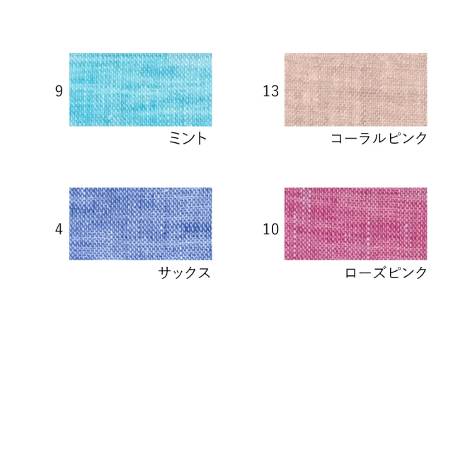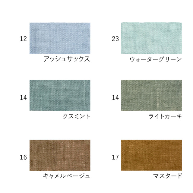 | カラー | シロ、オフシロ、ラベンダー、クリーム、アッシュパープル、ベージュ、アッシュサックス、ウォーターグリーン、クスミント、ライトカーキ、キャメルベージュ、マスタード、ミント、コーラルピンク、サックス、ローズピンク |