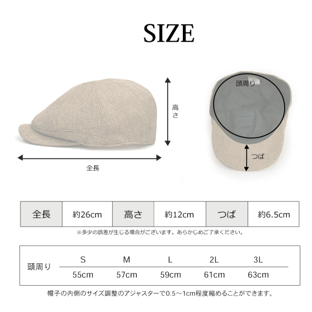 | サイズ | S(55cm)、M(57cm)、L(59cm)、LL(61cm)、3L(63cm) ※帽子の内側のサイズ調整テープで0.5~1cm程度縮めることが可能 |