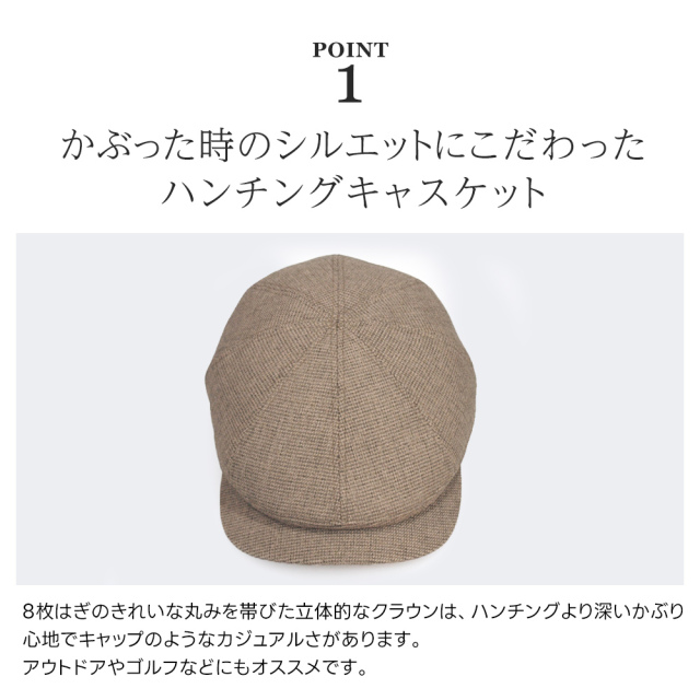 | 特徴 | 山鶴株式会社オリジナルブランド「HATBLOCK(ハットブロック)」。 その中でも「ハンチングキャスケット」は、8枚はぎのきれいな丸みを帯びた立体的なクラウンは、ハンチングより深いかぶり心地でキャップのようなカジュアルさがあります。 アウトドアやゴルフなどにもオススメです。 大正10年創業名古屋市熱田区の帽子メーカー山鶴株式会社の職人が、品質にこだわり、一つ一つ丁寧に製作しています。 |