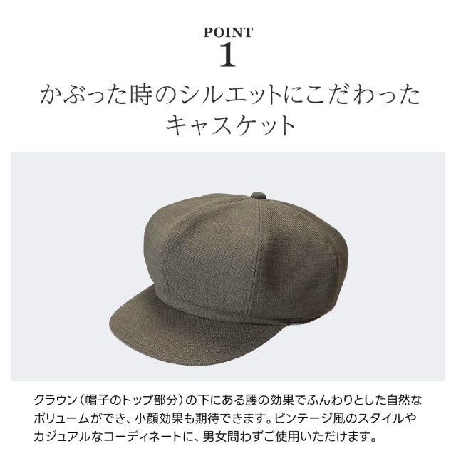 | 商品特徴 | 山鶴株式会社オリジナルブランド「HATBLOCK(ハットブロック)」。 その中でも「キャスケットヨーク」は、丸みのあるフォルムと大きめのつばが特徴です。キャップ感覚で被ることができ、カジュアルなコーディネートにぴったり。男女ともにおすすめです。 大正10年創業名古屋市熱田区の帽子メーカー山鶴株式会社の職人が、品質にこだわり、一つ一つ丁寧に製作しています。 |