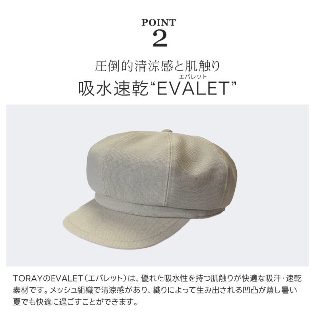| 生地特徴 | EVALET エバレット 優れた吸水性を持つ肌触りが快適な吸汗・速乾素材です。メッシュ組織で清涼感があり、織りによって生み出される凹凸が蒸し暑い夏でも快適に過ごすことができます。 |