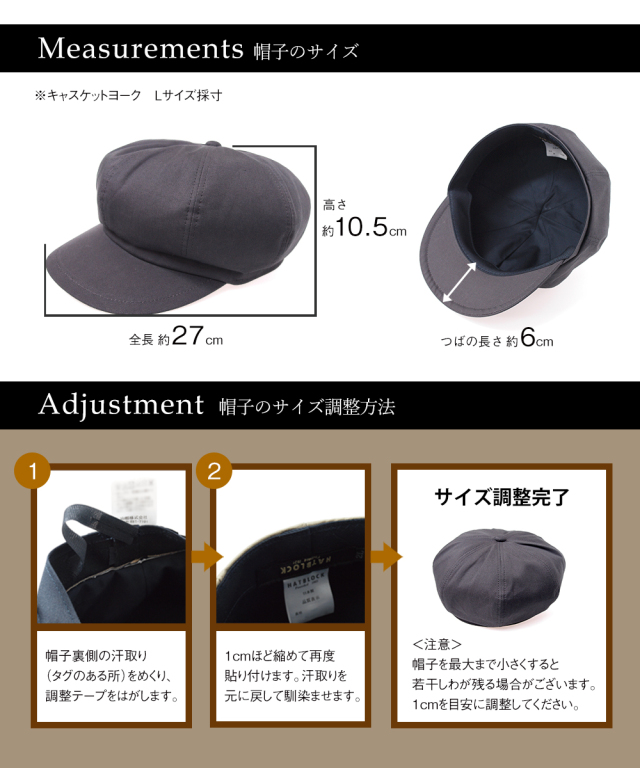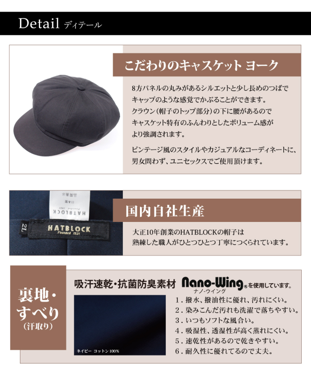 | 商品特徴 | 山鶴株式会社オリジナルブランド「HATBLOCK(ハットブロック)」。 その中でも「キャスケットヨーク」は、丸みのあるフォルムと大きめのつばが特徴です。キャップ感覚で被ることができ、カジュアルなコーディネートにぴったり。男女ともにおすすめです。 大正10年創業名古屋市熱田区の帽子メーカー山鶴株式会社の職人が、品質にこだわり、一つ一つ丁寧に製作しています。 |