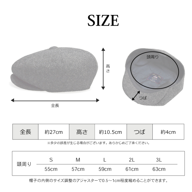 | サイズ | M(57cm)、L(59cm)、LL(61cm)、3L(63cm) ※帽子の内側のサイズ調整テープで0.5~1cm程度縮めることが可能 |