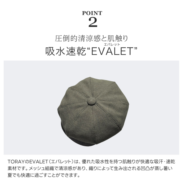 | 生地特徴 | EVALET エバレット 優れた吸水性を持つ肌触りが快適な吸汗・速乾素材です。メッシュ組織で清涼感があり、織りによって生み出される凹凸が蒸し暑い夏でも快適に過ごすことができます。 |